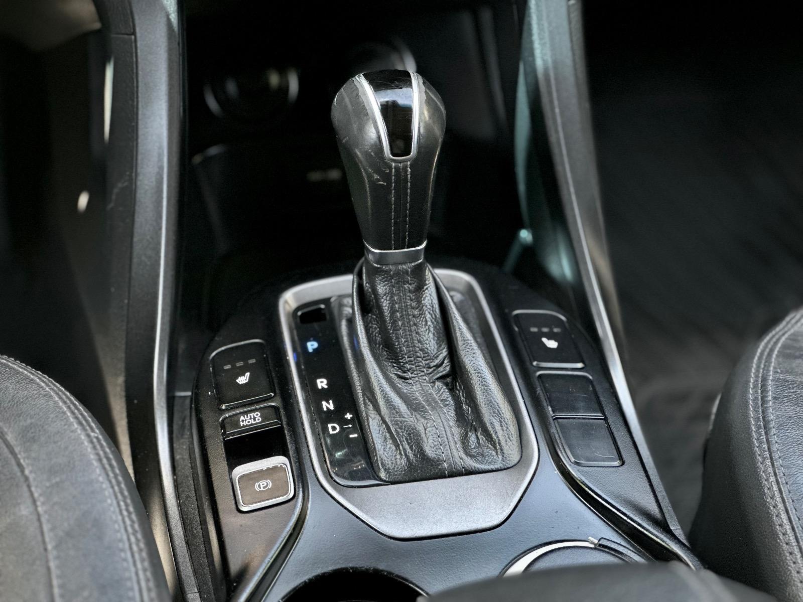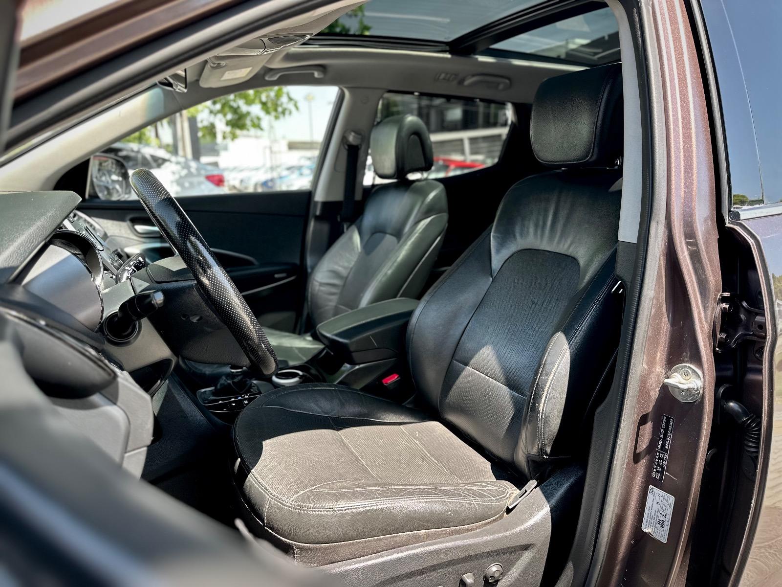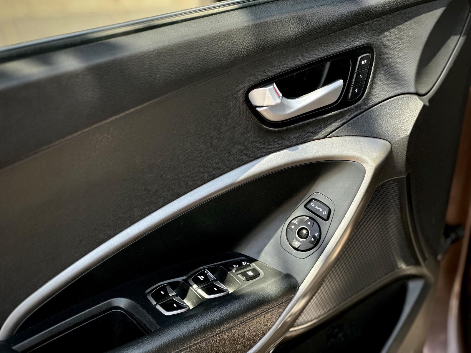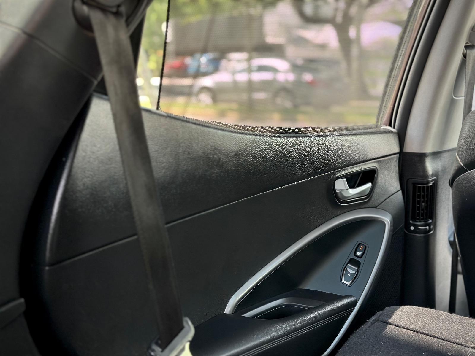 Hyundai Santa Fe GLS 2.4 Automática 2016, equipada con motor gasolina 2.4 y transmisión automática con modo tiptronic, destacando por su versatilidad, equipamiento familiar y confort de marcha. Incorpora tres corridas de asientos, climatizador bi-zona, cortinas de privacidad, anclajes ISOFIX y volante con rigidez configurable. Su equipamiento incluye luces de xenón, neblineros, llantas bi tono, pisaderas de acceso y techo panorámico sunroof. Ofrece asientos de cuero calefaccionados, ajuste eléctrico delantero con memoria para el conductor, botón de encendido, freno de mano electrónico, Auto Hold y modo ECO. En seguridad y asistencia incorpora cámara de retroceso con sensores, bloqueo de diferencial y asistente en descenso.