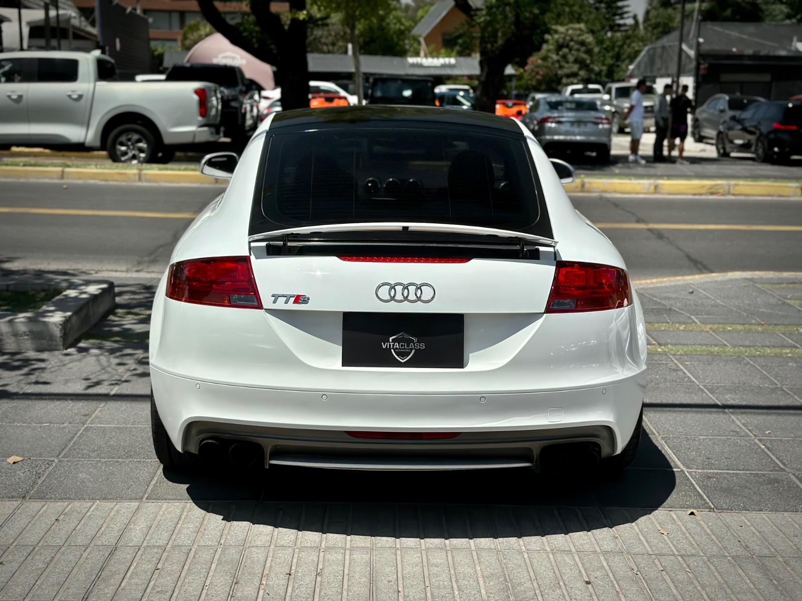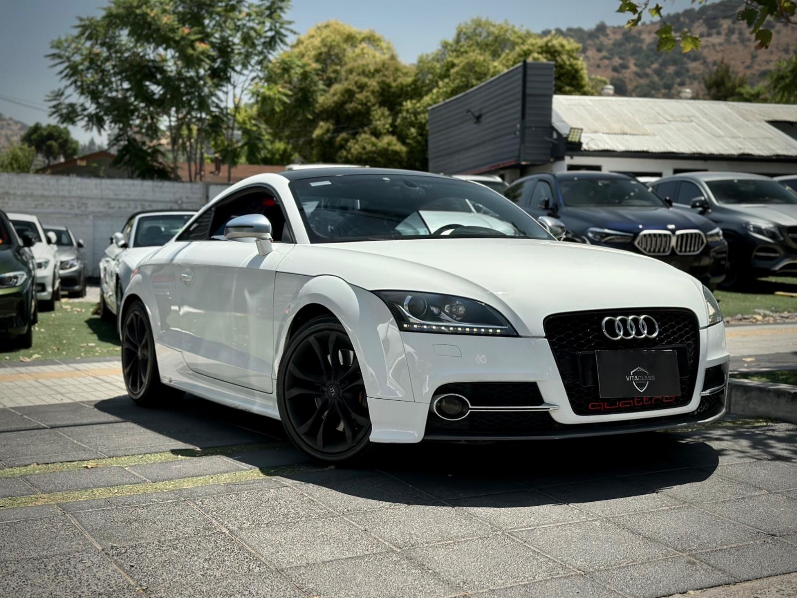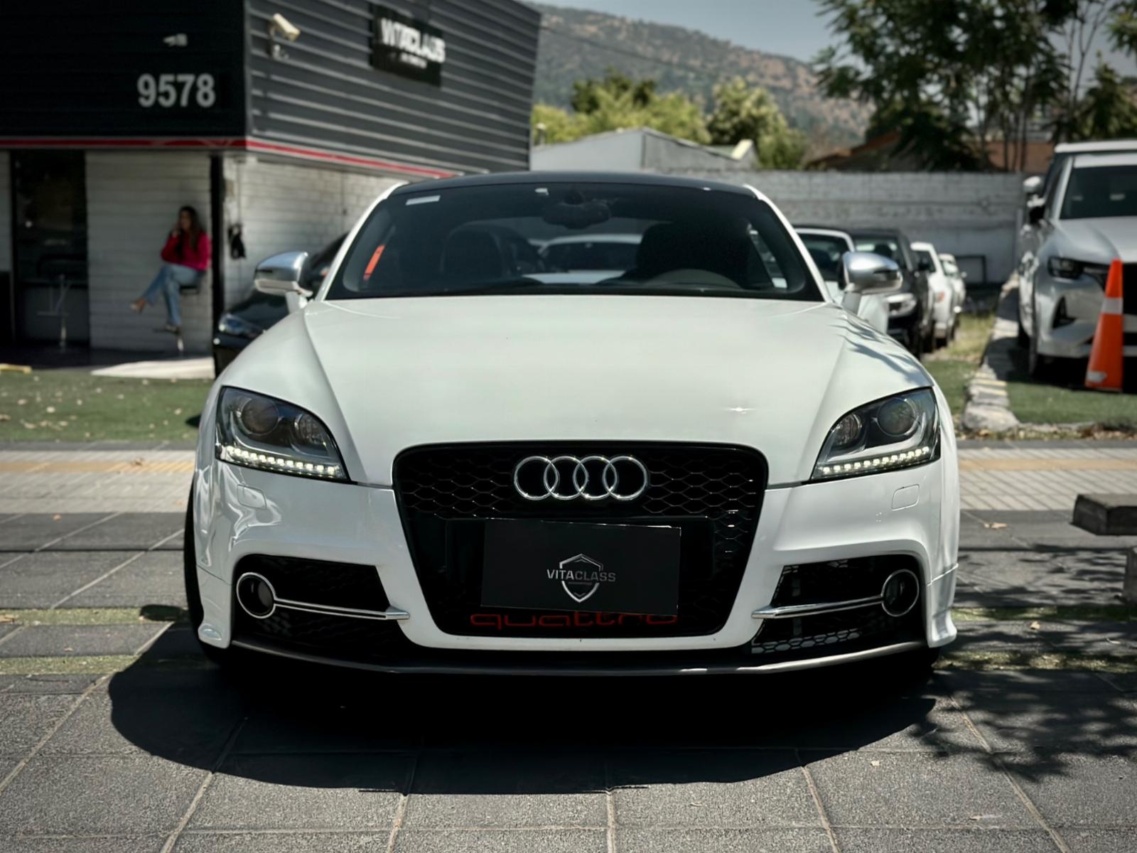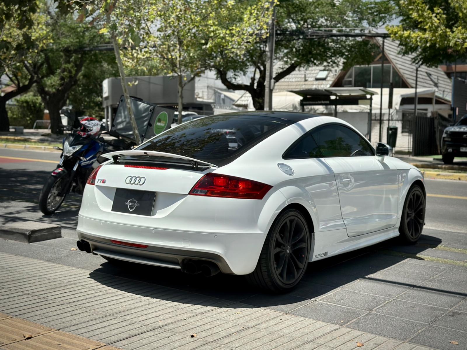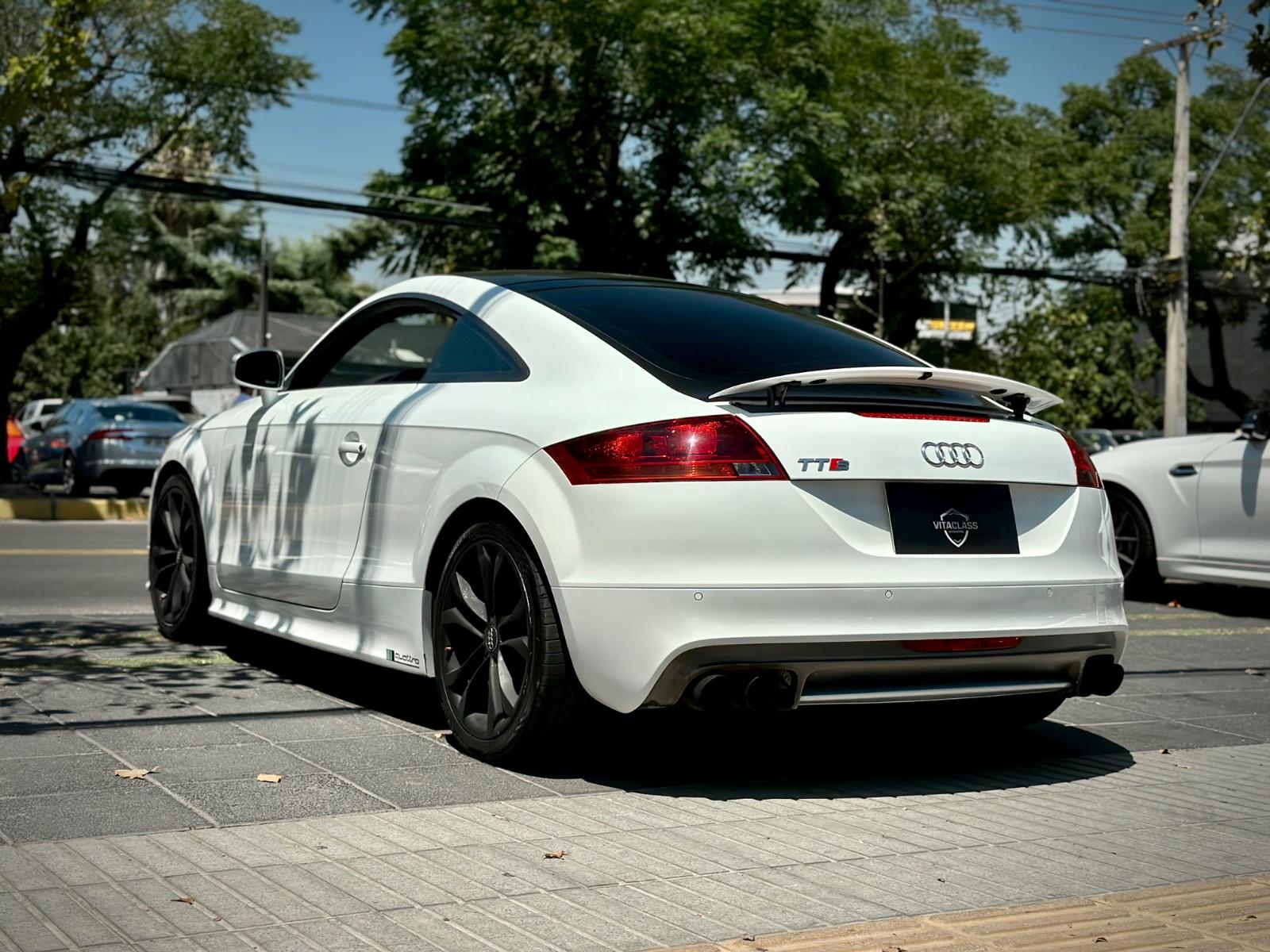 Audi TTS 2.0T Quattro 2014, deportivo de alto rendimiento con tracción integral y transmisión automática. Motor 2.0 turbo gasolina, ágil y potente, con suspensión Sport y modo Sport para una conducción más dinámica. Destaca por luces Xenón y LED, parrilla RS, llantas negro matte, spoiler retráctil y cuatro salidas de escape.