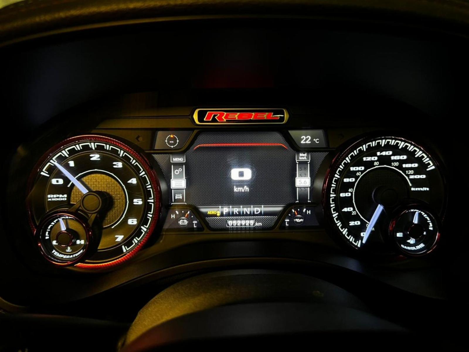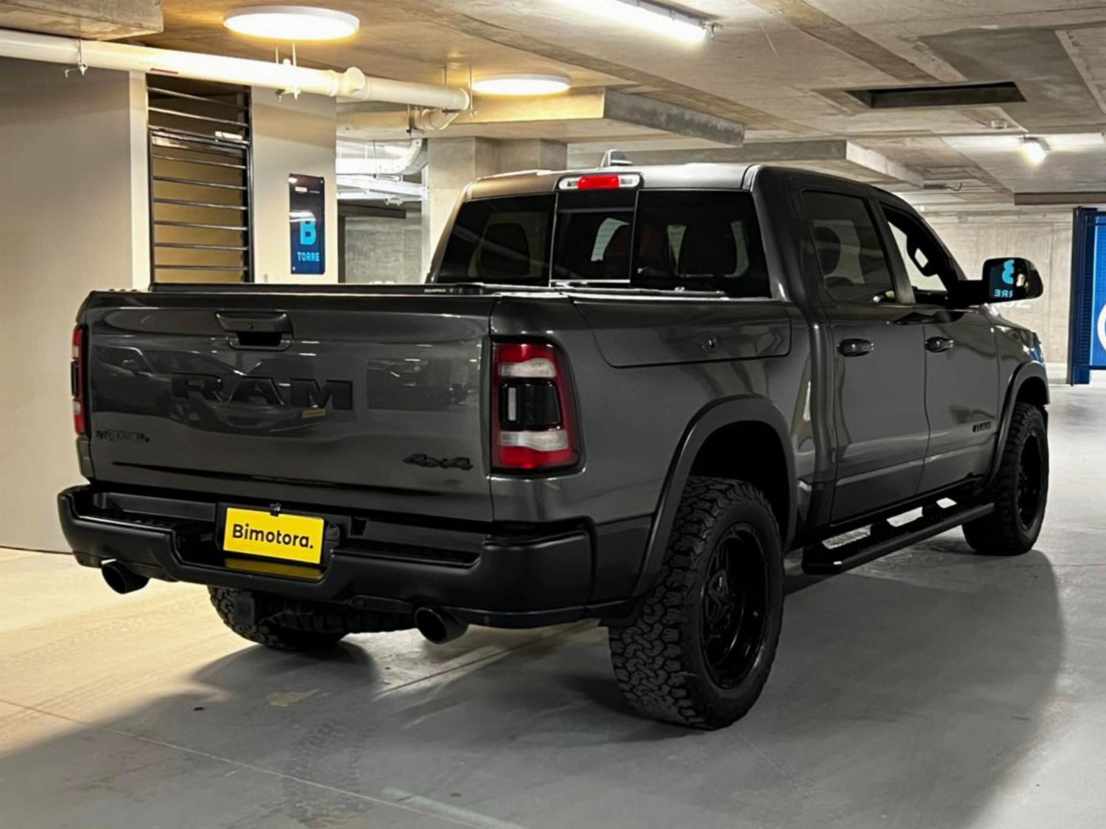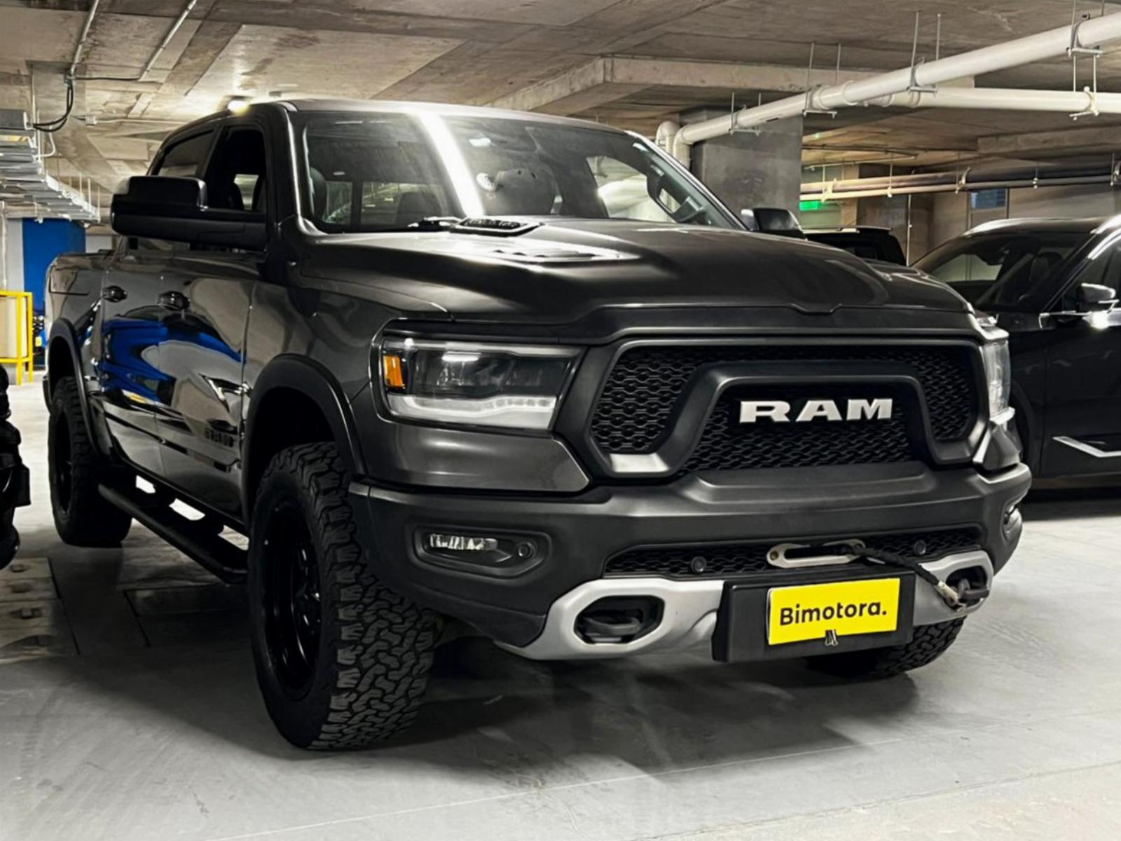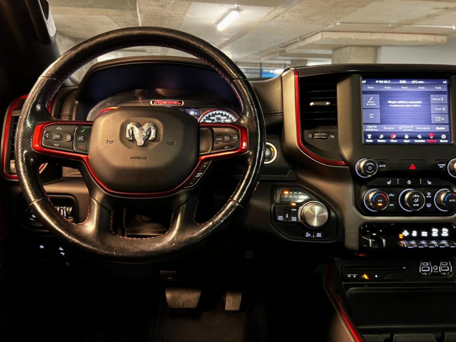 Neumáticos BF Goodrich, llantas KMC, versión 1500 Rebel, motor 5.700 CC ocho cilindros HEMI, tracción 4x4 con reductora, compartimiento rígido plegable cubre carga, pisaderas laterales, caja de cambios automática, suspensión regulable en altura y rigidez, volante multifuncional con velocidad crucero, calefaccion y comando por voz, computador a bordo, pantalla touch con cámara trasera de estacionamiento, Apple CarPlay y Android Auto, climatizadores delanteros independientes, botón de encendido start-stop, techo panorámico, sistema de audio alta fidelidad Alpine.