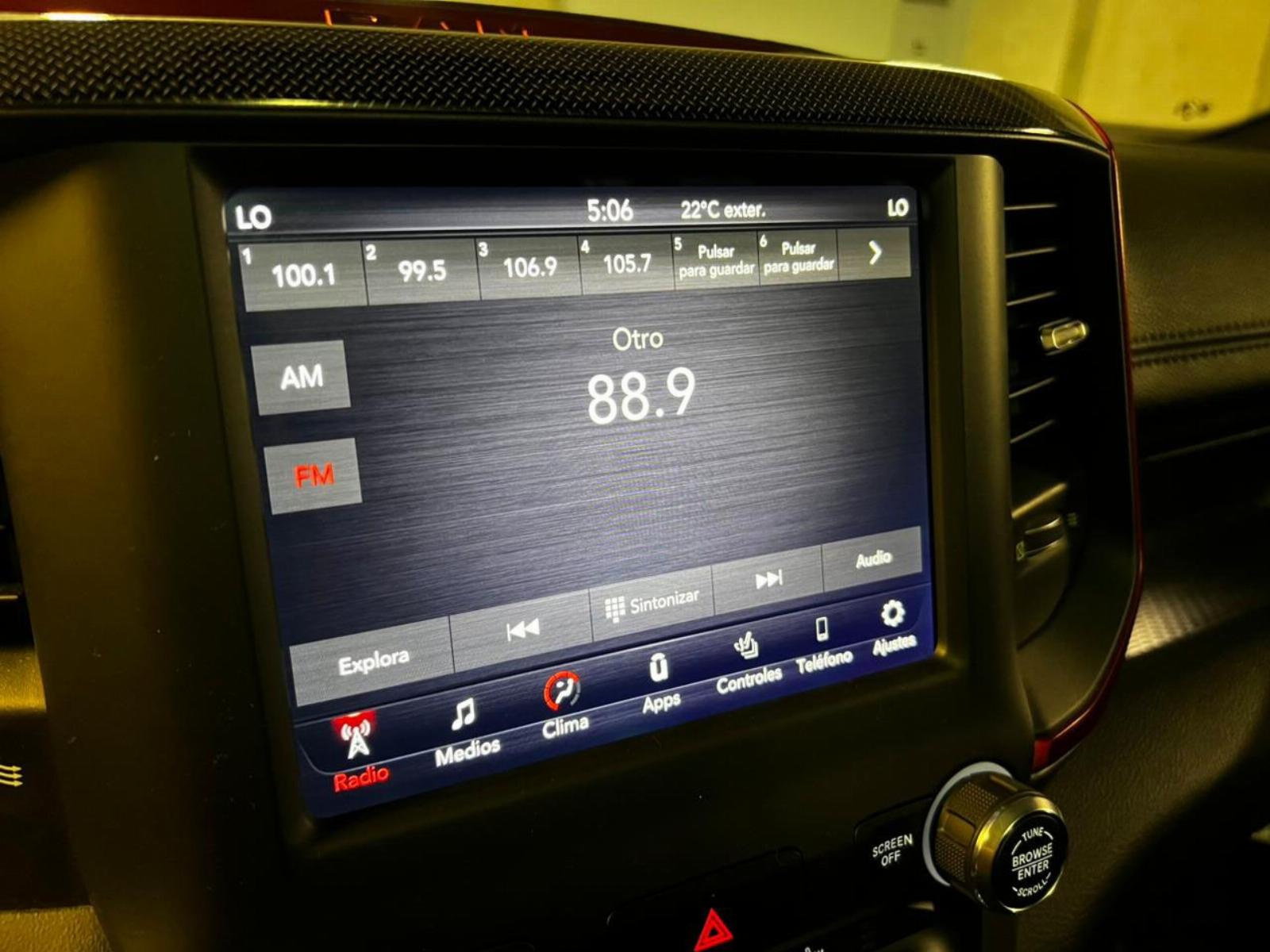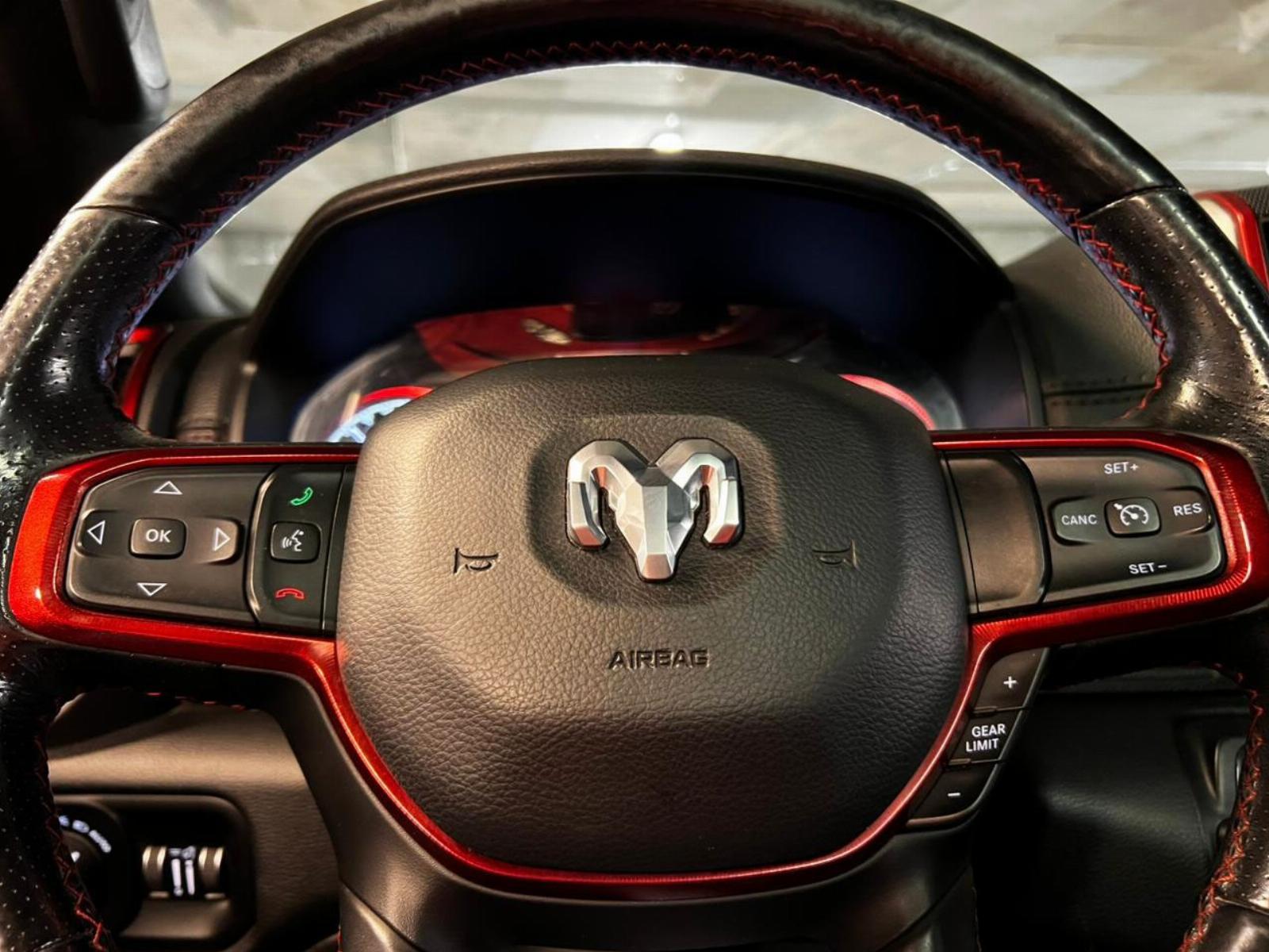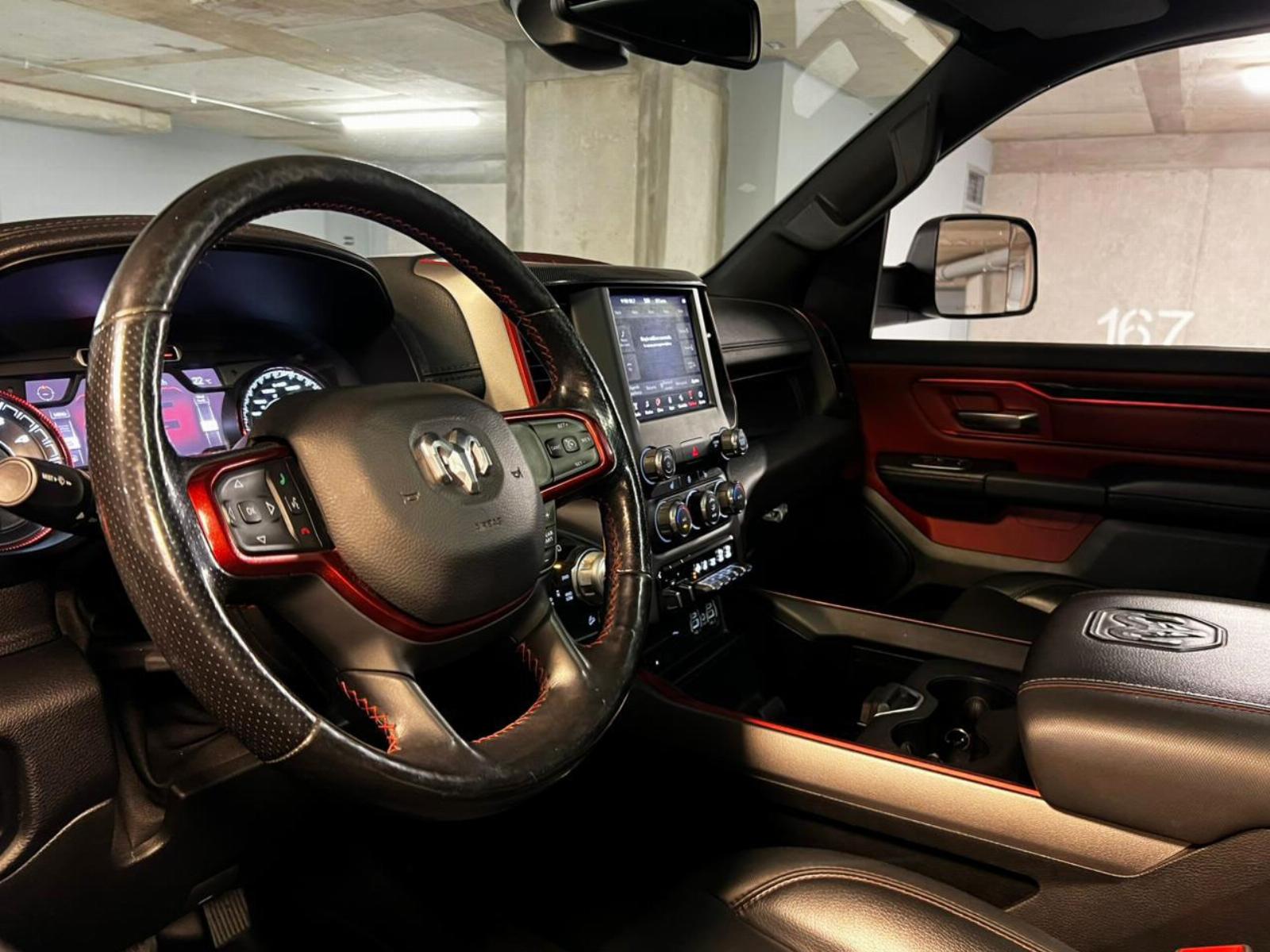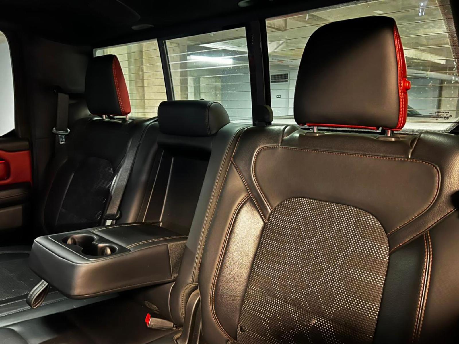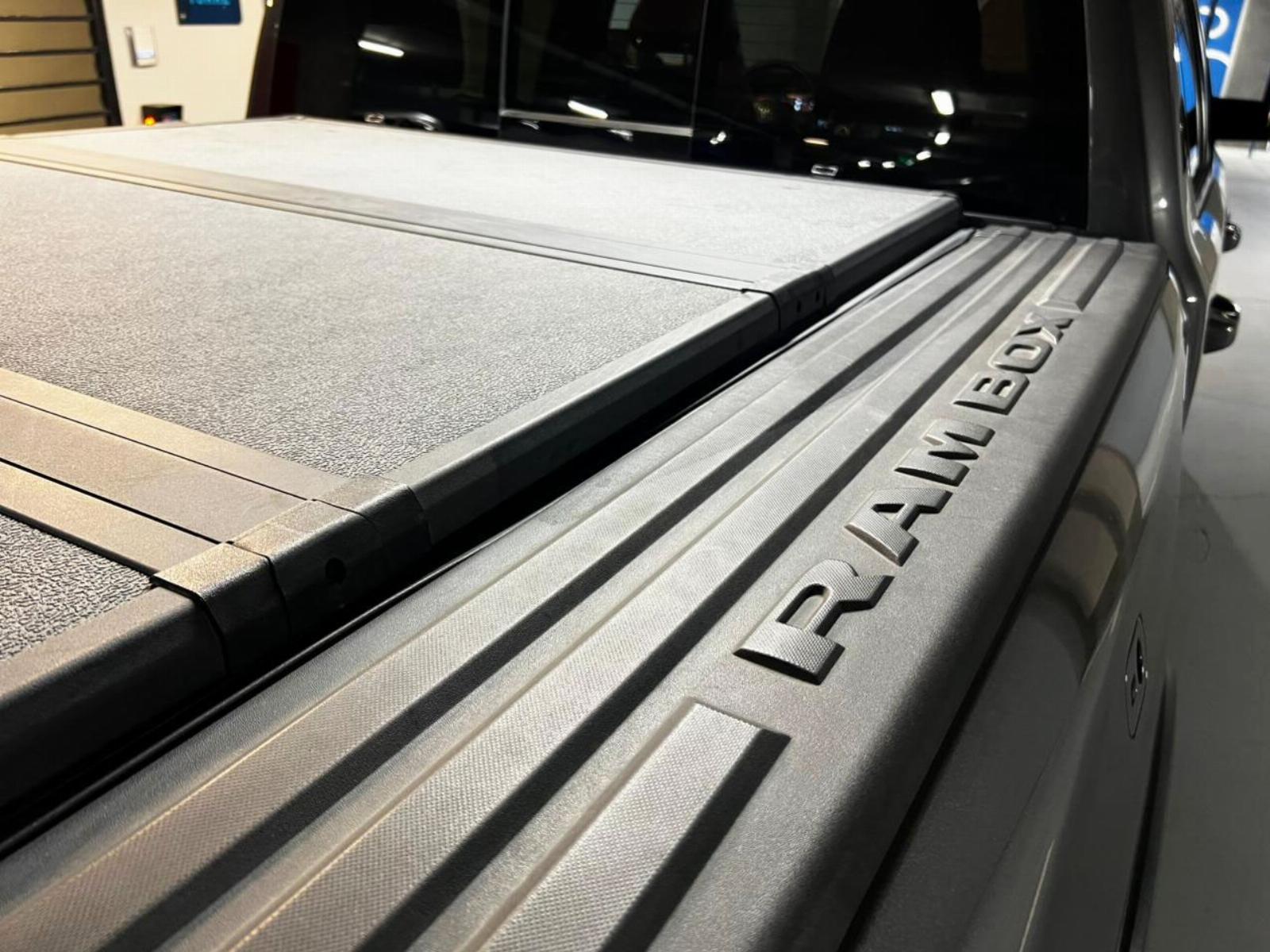 Neumáticos BF Goodrich, llantas KMC, versión 1500 Rebel, motor 5.700 CC ocho cilindros HEMI, tracción 4x4 con reductora, compartimiento rígido plegable cubre carga, pisaderas laterales, caja de cambios automática, suspensión regulable en altura y rigidez, volante multifuncional con velocidad crucero, calefaccion y comando por voz, computador a bordo, pantalla touch con cámara trasera de estacionamiento, Apple CarPlay y Android Auto, climatizadores delanteros independientes, botón de encendido start-stop, techo panorámico, sistema de audio alta fidelidad Alpine.