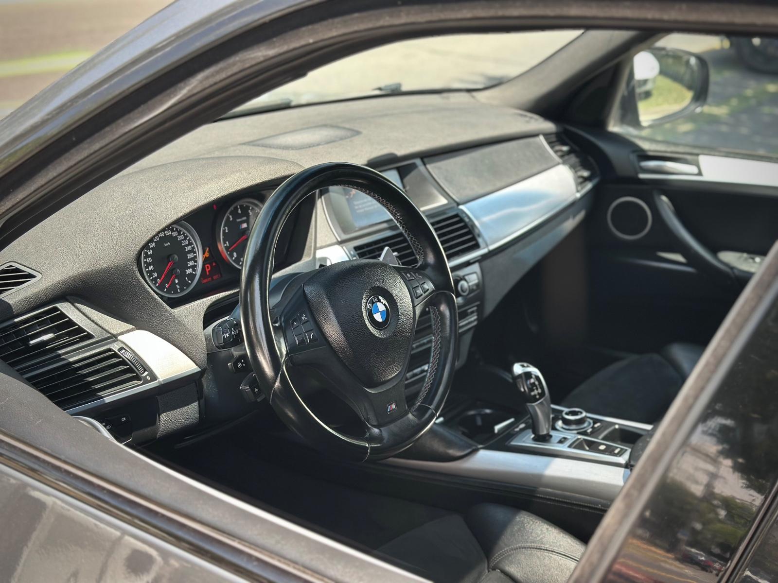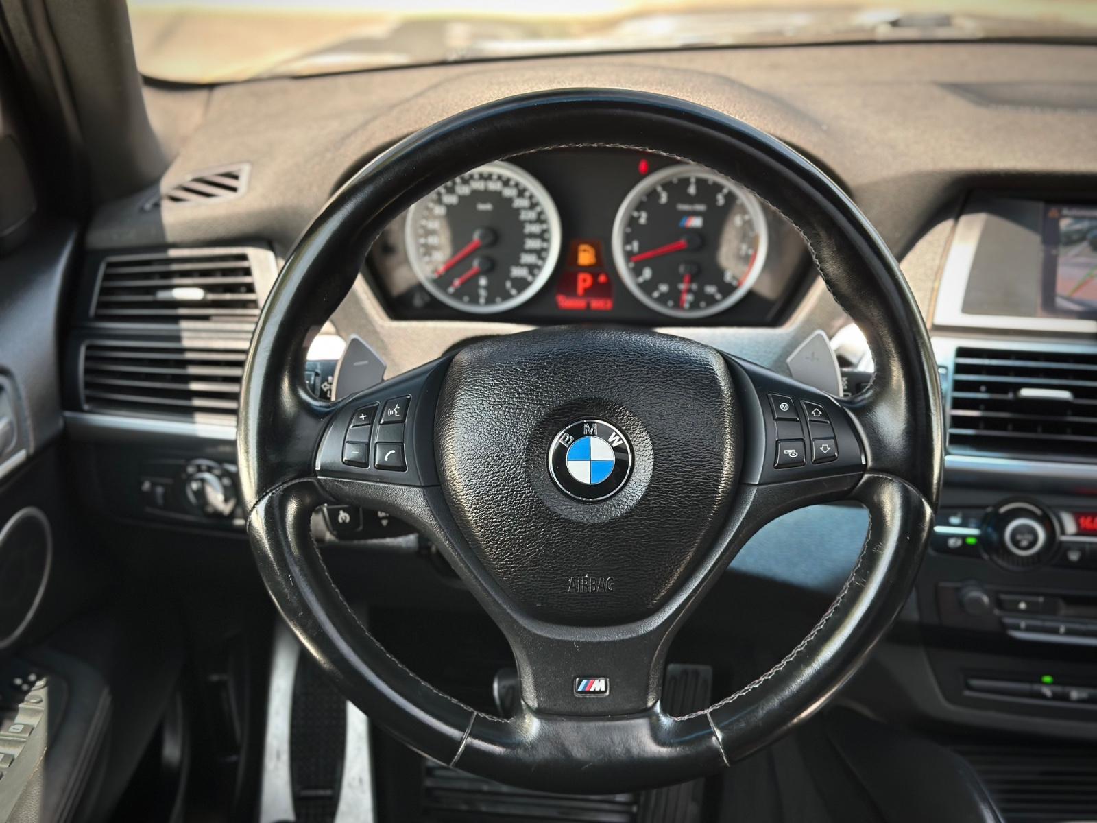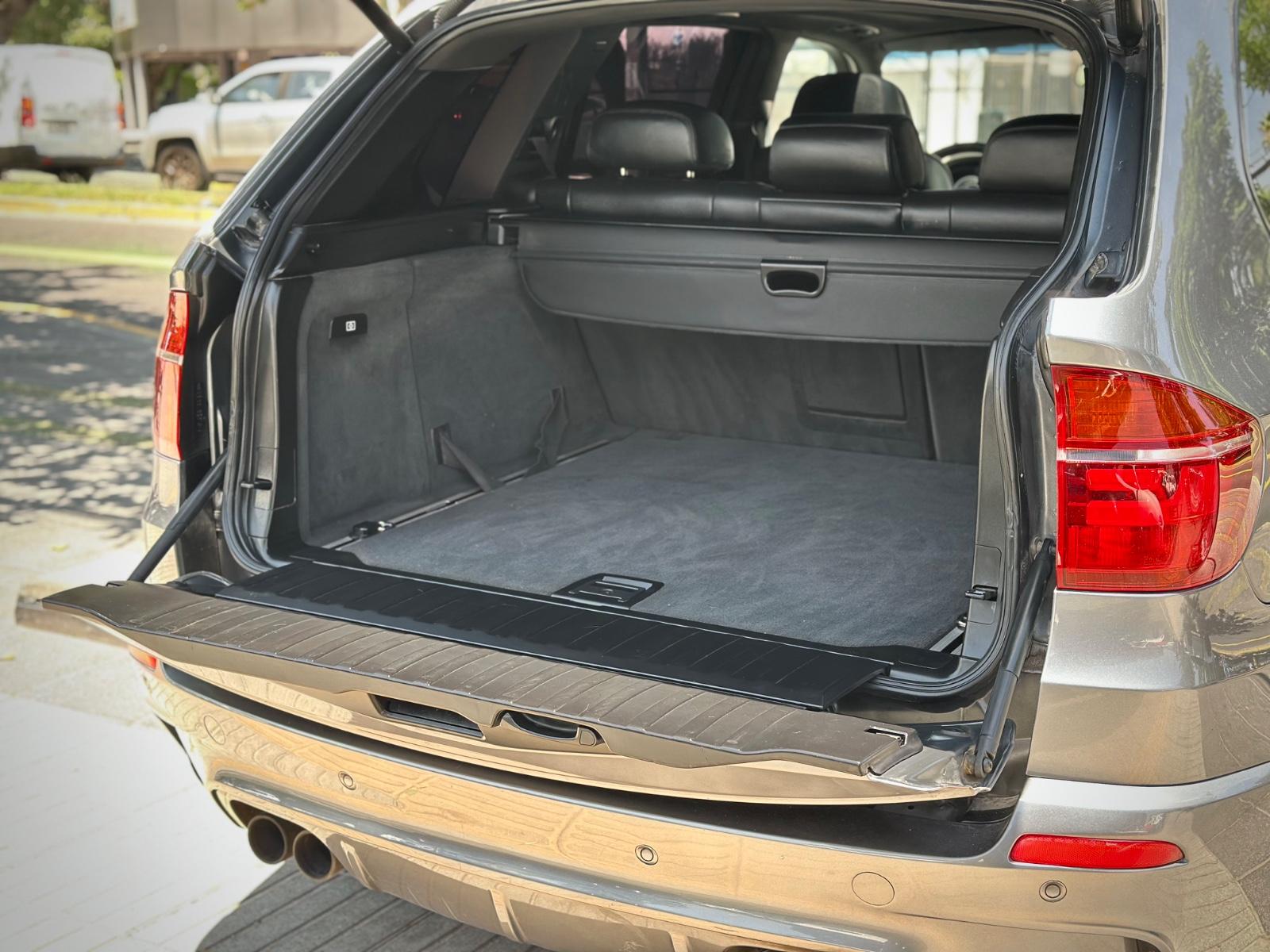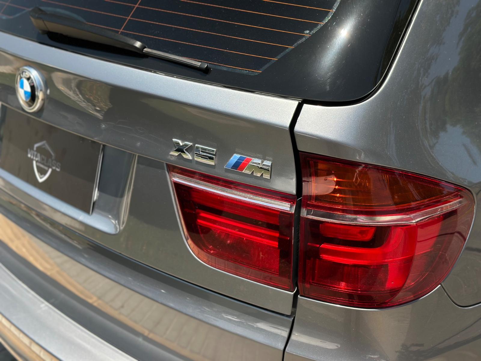BMW X5M xDrive 2012, SUV de alto desempeño equipado con motor 4.4 V8 Biturbo a gasolina y transmisión automática, con 108.689 km. Versión deportiva con 555 HP y tracción integral xDrive, que entrega una conducción potente y dinámica. Incorpora llantas de aleación en negro glossy, luces de xenón y frenos M, junto a sensores de estacionamiento 360° y cámara de retroceso. Interior con butacas en cuero y alcántara, eléctricas, calefactables y con memoria, además de climatizador de 3 zonas y sunroof panorámico. Destaca su suspensión neumática, volante multifuncional con ajuste eléctrico, paddle shift en aluminio, control crucero y apertura eléctrica de portalón, Modos de conducción.